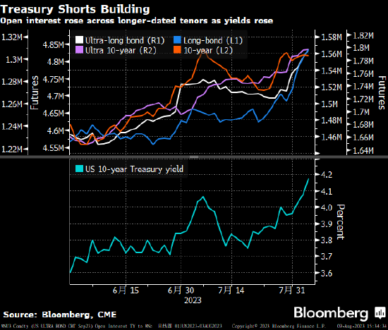 上周美债大跌,10年期收益率一度升至4.20%,即11月以来的最高水平,未平仓合约(投资者承担的风险)上升,表明有新的空头头寸。