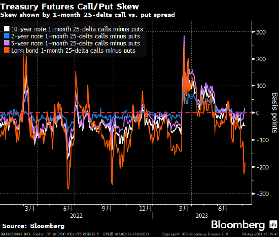 过去一周长期利率波动剧增,相对中短期美债,对冲30年期品种下跌风险的成本飙升。 在美债期权中,10年期和5年期品种都出现了上涨风险对冲交易。