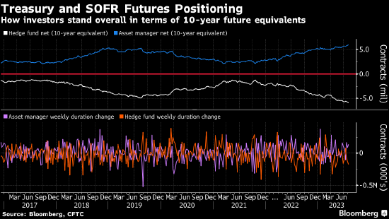 最新的CFTC头寸数据显示,持空头立场的对冲基金与持多头立场的资产管理公司分歧继续扩大,对冲基金相当于净增加了17.6万份10年期期货合约的空头头寸,资产管理公司则相当于净增加了13.7万份10年期期货合约的多头头寸。