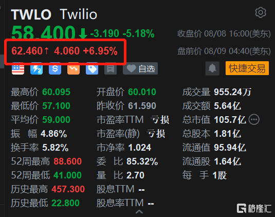 格隆汇8月9日丨通信服务公司Twilio(TWLO.US)盘前涨6.95%,报62.46美元。公司第二季度业绩显示,销售额同比增长10%至10.4亿美元,分析师平均预期为9.86亿美元;本季度新增304,000个活跃用户账户,与预期一致。 调整后的年度收入将从5月份的预测的3.5亿美元增至3.5亿至4亿美元。