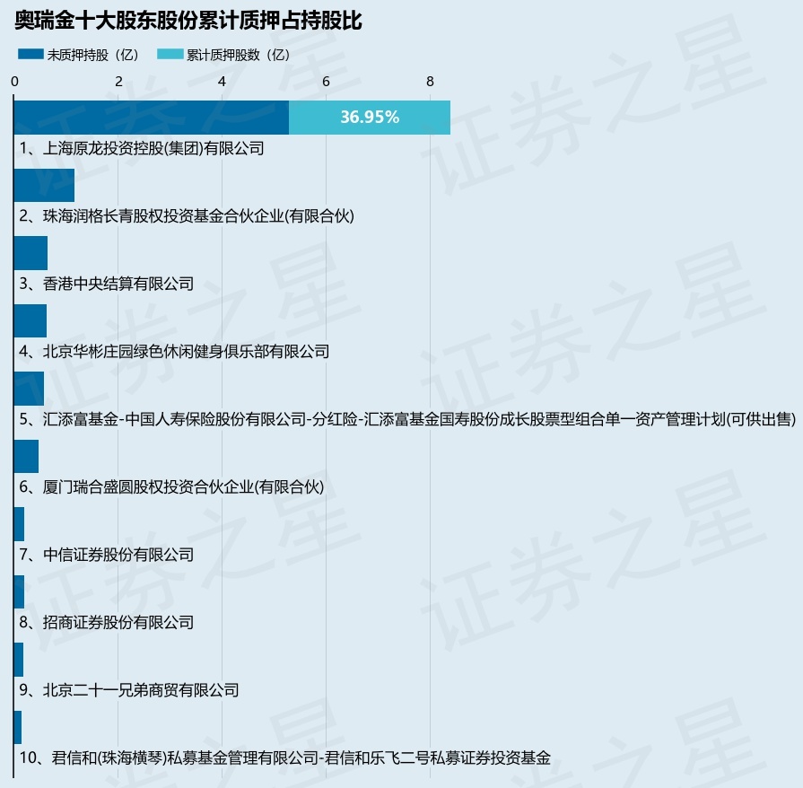 截止本公告日,股东上海原龙投资控股(集团)有限公司已累计质押股份3.11亿股,占其持股总数的36.95%。本次质押后奥瑞金十大股东的累计质押股份占持股比例见下图: