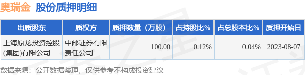 奥瑞金(002701)8月9日公开信息显示,股东上海原龙投资控股(集团)有限公司向中邮证券有限责任公司合计质押100.0万股,占总股本0.04%。质押详情见下表:
