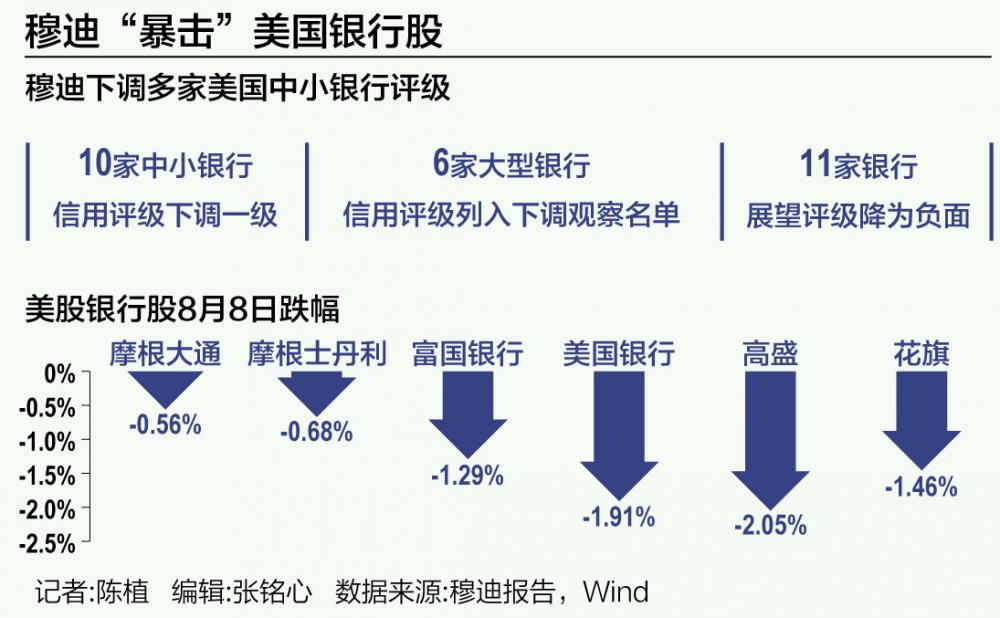 8月8日晚,穆迪发布公告,下调美国10家地区银行信用评级,将6家大型银行评级列入潜在下调的观察名单,并将11家主流银行的前景展望从稳定调整为负面。