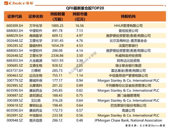具体来看,HHLR管理有限公司持有万华化学1885.25万股,市值高达16.56亿元;普信投资集团持有中望软件481.78万股,市值7.13亿元;施罗德投资管理(香港)有限公司二季度增持南微医学86.3万股,总持股达到609.12万股,市值4.97亿元,此外该机构还持有中望软件286.08万股、再升科技800.72万股。