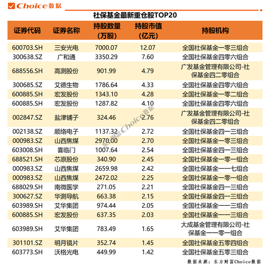 社保持股市值方面,在已公布2023年半年报的上市公司中,全国社保基金一零三组合持有三安光电7000.07万股,持股市值12.07亿元;全国社保基金四零六组合、一一五组合分别持有广和通3350.29万股、522万股,市值7.6亿元、1.18亿元;宏发股份、山西焦煤均被三只社保基金持有,持仓总市值分别为10.41亿元、7.37亿元。