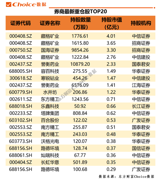 此外,招商证券持有国海证券9854.26万股,持股市值3.3亿元;国泰君安、江海证券分别持有誉衡药业10879.2万股、6576.09万股,持股市值2.33亿元、1.41亿元;华泰证券持有容百科技275.55万股,持股市值1.49亿元。