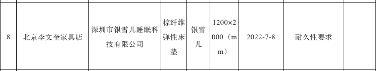 其中,标称生产者/生产者为“深圳市银雪儿睡眠科技有限公司”生产的规格型号为“1200×2000(mm)”的“棕纤维弹性床垫”抽检不合格,不符合项为“耐久性要求”。