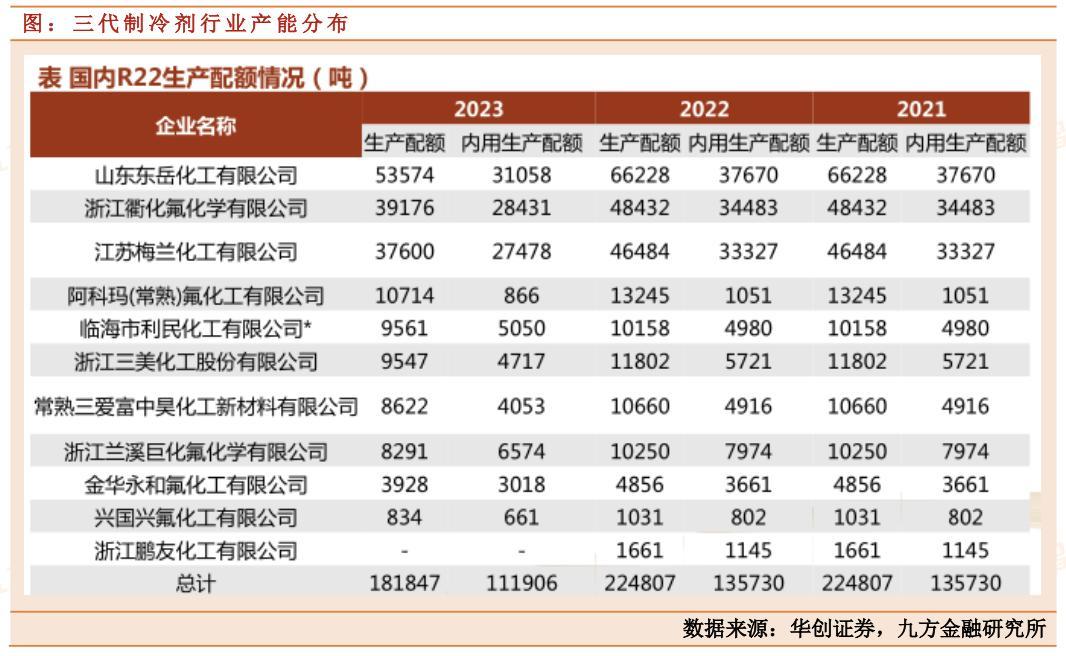 公司拥有氢氟酸产能 13.1 万吨,公司现有二代制冷剂产能方面: R22产能 1.44万吨、R142b 产能 0.42 万吨、R141b 产能 3.56万吨,2022 年度公司获得的上述产品配额分别为 1.18 万吨、0.25 万吨、2.80 万吨,占全国总配额的比例分别为 5.25%、18.23%、55.05%。二代制冷剂总产能5.42万吨。