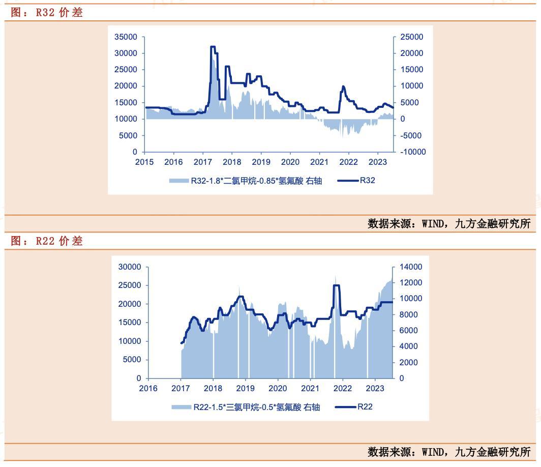 目前 R32市场均价14,000元/吨,价差为1,951元/吨,8月均价为14,000元/吨,环比+3.52%;2023年均价为14,172元/吨。R22市场均价19,000元/吨,价差为10,711元/吨, 8月均价为19,000元/吨,环比持平;2023年均价为19,198元/吨。二代制冷剂价格坚挺,及时今年夏季多雨水,价差也在历史高位,主要原因是配额心态影响下厂家觉得以后二代供给是必然要缩减的,现在能卖多少是多少,以后就没了。目前三代制冷剂价格还是下滑明显,主要还是前几年行业内企业为了抢配额产能,同时叠加行业内配额还未分配,国家不限制产能销售,所以价格受到压制。展望未来,今年三代配额分配后,行业配额格局稳定,制冷剂价格中枢也会慢慢上移,企业收益也会改善。
