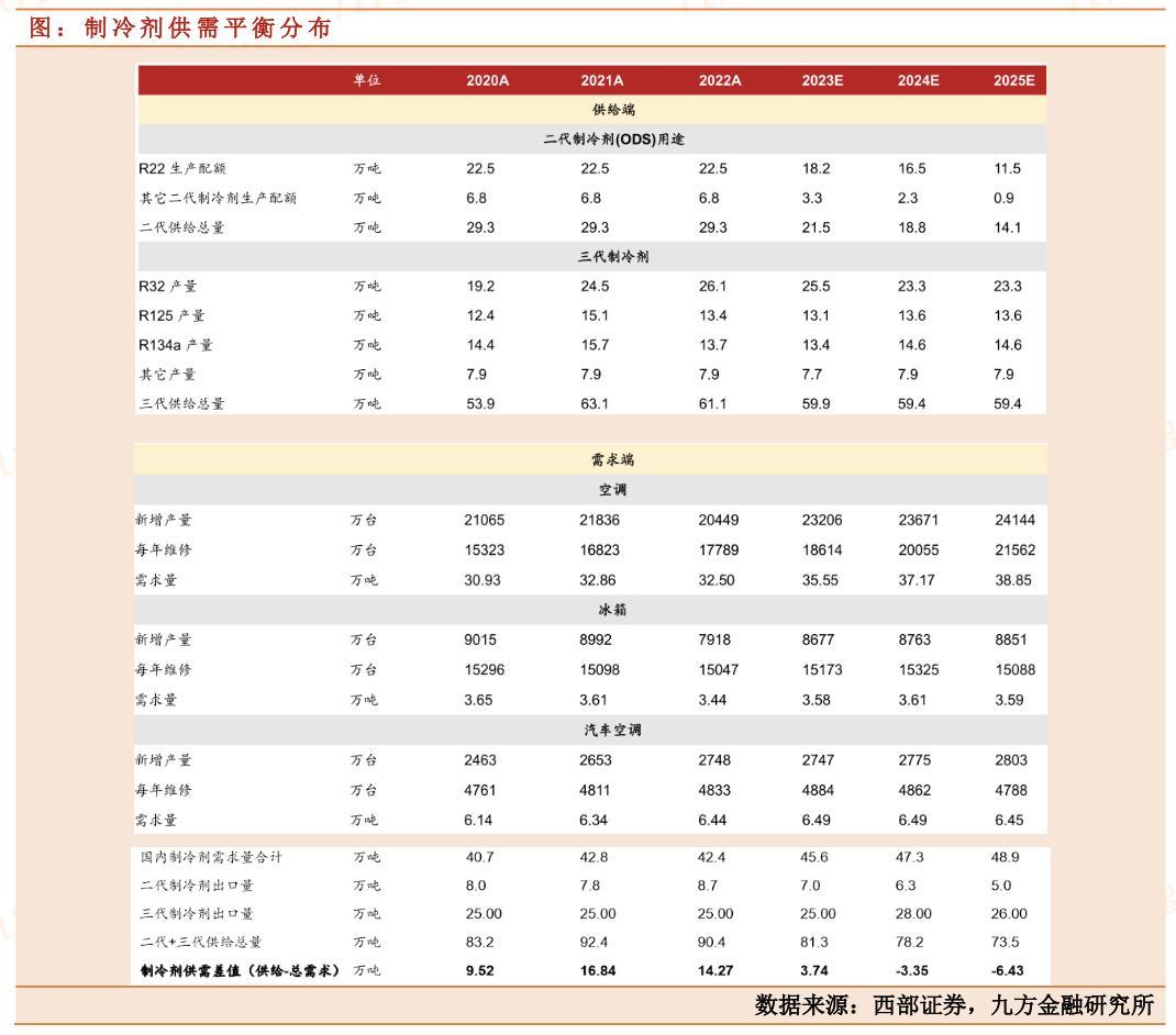 制冷剂下游需求主要用于空调,汽车,冰箱中,其中空调占比约78%、冰箱占比约16%、汽车占比约6%。2022年国内空调产量达到2.22亿台,同比+2%,冰箱产量达到8664万台,同比-4%,汽车产量达到2686万辆,同比+2%。我国制冷剂下游需求是比较稳定的,制冷剂最大下游是空调,我国每年空调产量在2.22亿台,从2018年高点以来,基本保持在2亿台以上,每年新增空调+维修空调需要用的制冷剂在35万吨左右。全球每年需求制冷剂在77万吨左右,过去来看,在二代制冷剂时代,制冷剂总体产能是过剩的,几次价格的大幅上涨,来自于供给端政策的改变,供给侧改革,能耗双控等。未来随着三代制冷剂配额分配结束,整个制冷剂行业二代制冷剂会每年递减,知道2030年全球禁止使用,这个过程必然伴随着制冷剂价格中枢的不断抬升,一方面是因为供需关系,一方面是因为制冷剂成本上行。