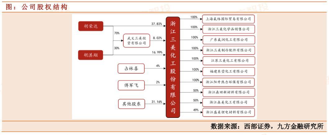 公司简介:三美股份核心业务是氟制冷剂,氟发泡剂和氟化氢氟化工业务。公司2001年成立,20多年,一直致力于发展氟化工行业,目前公司氟化工可以实现产业链一体化生产。公司是家族企业,实际控制人是胡荣达父子,两人直接或间接持股比例总计为 62%。