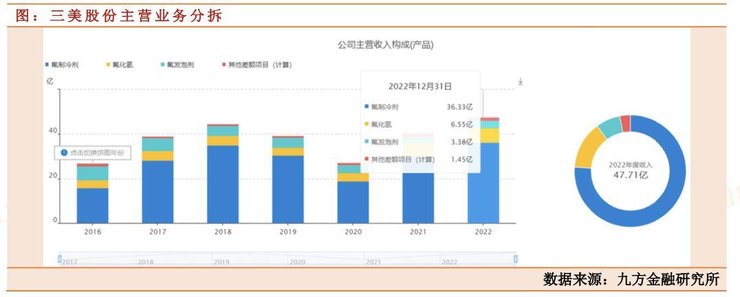 主营业务分析:三美股份2023年实现营收47.7亿,其中制冷剂业务实现营收36.33亿,占比76%,属于公司核心业务。