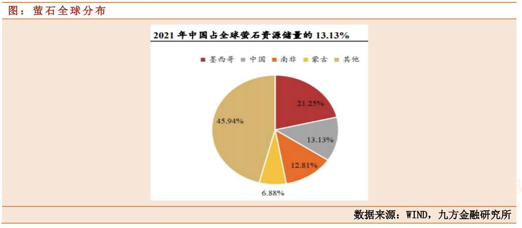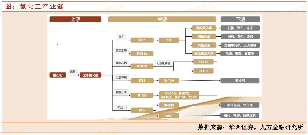 上游是萤矿石,和硫酸反应得到氢氟酸,氢氟酸通过一系列化学反应得到制冷剂R22,R32等。制冷剂下游主要用作生活的各个方面,有汽车,医药,家电,塑料,航天等等各个方面,但是最大的下游是用在制冷方面。世界萤石总储量为3.2亿吨(折合CaF2),其中墨西哥、中国、南非、蒙古萤石储量位列前四,分别为6800万吨、4200万吨、4100万吨、2200万吨,占全球萤石储量比分别为21.25%、13.13%、12.81%、6.88%。我国萤石产量540万吨,占据全球总产量的 62.79%,为全球萤石最大生产国。未来随着国内萤石矿石资源的缩减,上游萤石的价格会不断抬升,氟化工也会有一定的成本支撑。