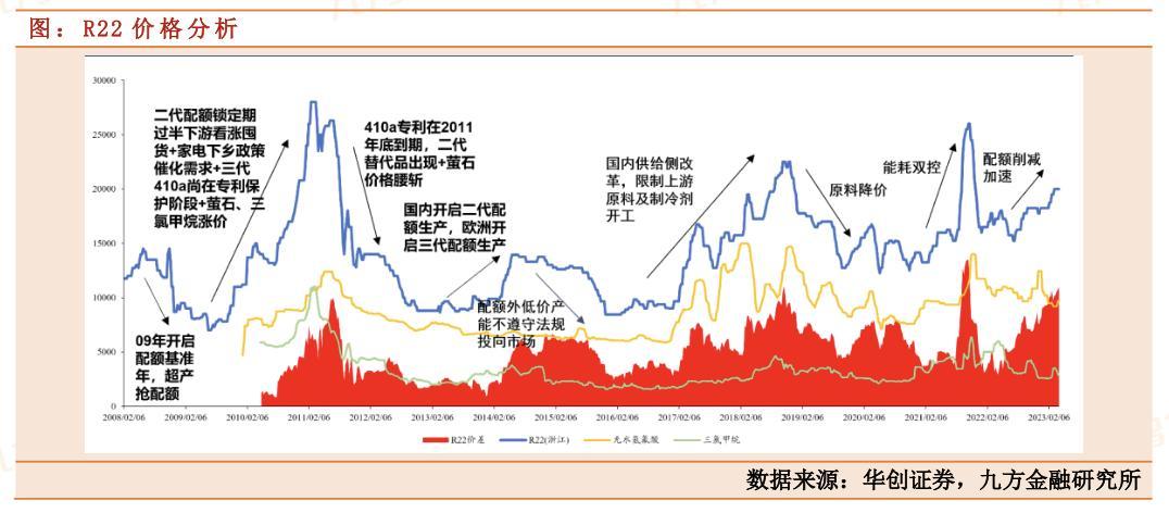 制冷剂行业和其他化工品行业有不同点在于配额制,行业内企业没有国家给的生产额度是没办法进行生产销售的,即使你有产能。制冷剂的价格波动周期受到需求和行业内有配额的厂家供给端生产情况影响。以二代制冷剂主力R22分析,拉长价格复盘来看,R22的价格中枢都在慢慢提升,从1万到目前2万。主要原因是二代制冷剂的配额在不断的减小的原因。目前处在三代制冷剂配额分配前夜,复盘二代制冷剂价格,我们可以得出三代制冷剂价格也是一样,价格中枢长期会不断抬升,中短期会受到行业供需错配的影响价格波动。