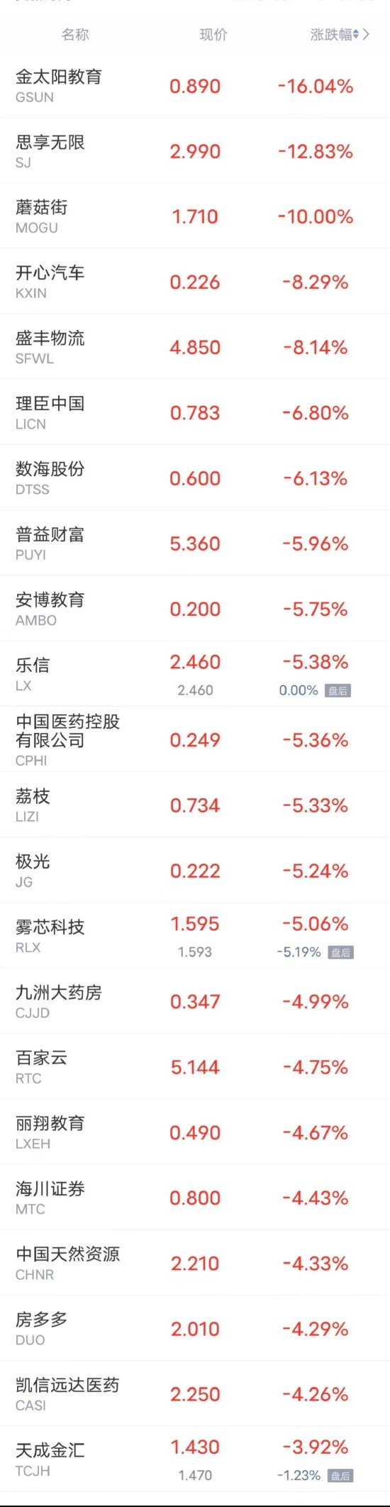 金太阳教育跌超16%,思享无限跌超12%,蘑菇街跌10%,开心汽车,盛丰物流跌超8%,理臣中国,中国医药控股有限公司,数海股份跌超6%,普益财富,安博教育,乐信,荔枝,极光,雾芯科技跌超5%,九洲大药房,百家云,丽翔教育,海川证券,中国天然资源,房多多,凯信远达医药跌超4%,天成金汇,魔线,聪链集团,敦信金融,海银财富跌超3%。