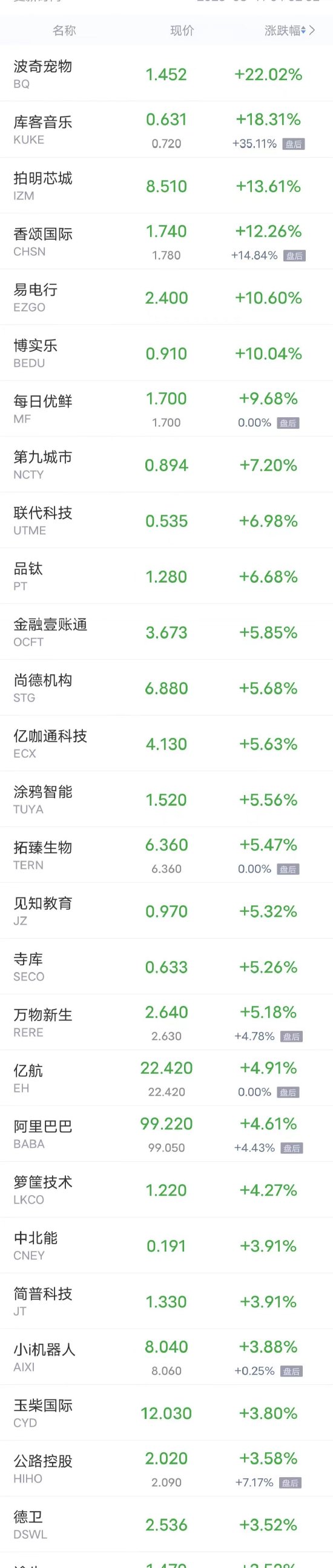 波奇宠物涨超22%,库客音乐涨超18%,香颂国际涨超12%,易电行,博实乐涨超10%,每日优鲜涨超9%,第九城市涨超7%,联代科技,品钛,金融壹账通,尚德机构,亿咖通科技,涂鸦智能,拓臻生物,见知教育,寺库,万物新生等涨超5%,亿航,阿里巴巴,箩筐技术等涨超4%。中北能,小i机器人,公路控股,玉柴国际,德卫,途牛,水滴公司,康迪车业,宝盛科技,悦商集团,简普科技等涨超3%。