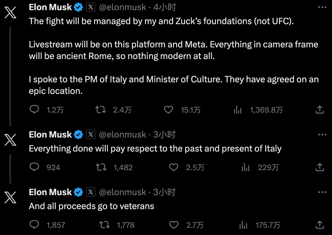 马斯克周五在X上透露了这场世纪大战的更多细节。他表示:“这场比赛将由我和扎克的基金会(而不是UFC)管理。直播将在这个平台和Meta上进行。镜头里的一切都将是古罗马风格,和现代毫无关系。我与意大利总理和文化部长进行了交谈。他们已经商定了一个史诗般的地点。”