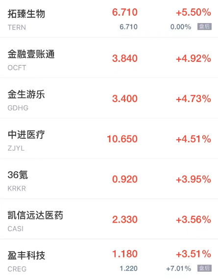 海天网络涨超20%,能链智电涨超6%,拓臻生物涨超5%,迅雷、易电行涨超4%,泛华金融、奇景光电、海银财富涨超3%,金融壹帐通、1药网涨超2%,逸仙电商、亘喜生物、复朗集团涨超1%。