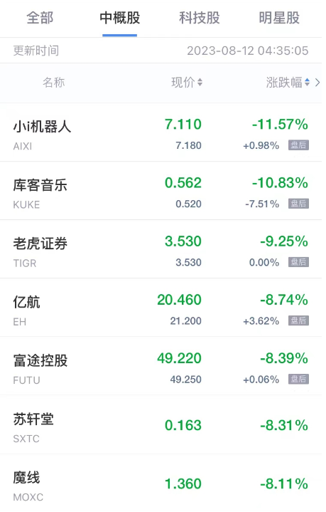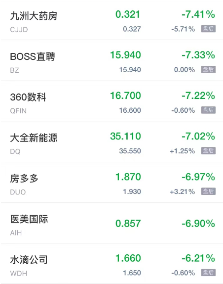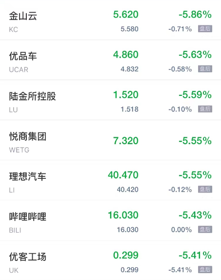 小i机器人跌超11%,老虎证券跌超9%,亿航跌超8%,BOSS直聘、360数科、大全新能源跌超7%,水滴公司、优品车跌超6%,陆金所控股、金山云、理想汽车、名创优品、哔哩哔哩、优克联、虎牙、京东、万国数据、唯品会跌超5%,新氧、小赢科技、知乎、信也科技、趣店、猎豹移动、达达集团、华住酒店、百度、叮咚买菜跌超4%,网易、中阳金融、阿特斯、满帮、拼多多、乐信、禾赛科技、怪兽充电、挚文集团、网易有道、亿咖通科技、嘉银金科跌超3%,小鹏汽车、台积电、新东方、斗鱼、小牛电动、贝壳、涂鸦智能、蔚来、腾讯音乐、高途、爱奇艺、嘉楠科技、携程跌超2%,汽车之家、盛丰物流、康迪车业、联电、亚朵集团、南茂科技、慧荣科技跌超1%,欢聚集团跌近1%。