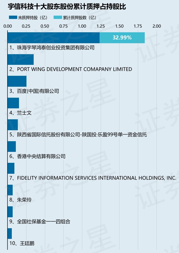 截止本公告日,股东珠海宇琴鸿泰创业投资集团有限公司已累计质押股份6078.73万股,占其持股总数的32.99%。本次质押后宇信科技十大股东的累计质押股份占持股比例见下图:
