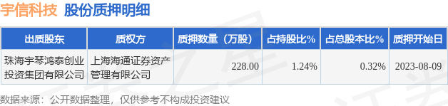 宇信科技(300674)8月11日公开信息显示,股东珠海宇琴鸿泰创业投资集团有限公司向上海海通证券资产管理有限公司合计质押228.0万股,占总股本0.32%。质押详情见下表: