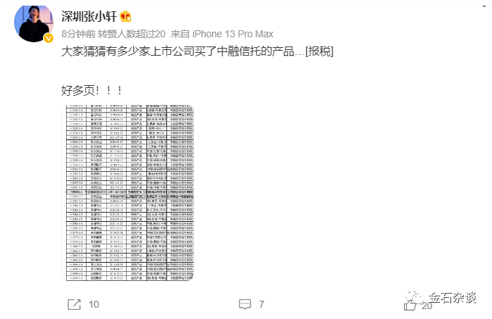 有财经博主只呈现一页上市公司买入中融信托的产品,就有近20家,但他表示有好多页,而数据来源兴证策略,不觉让人后背发凉!