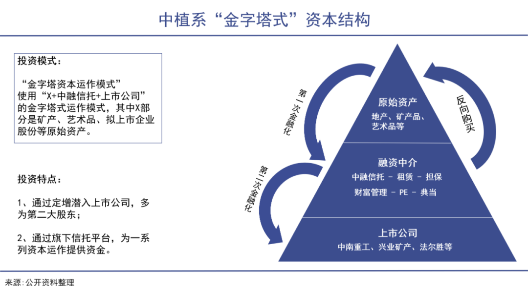 以中融信托为融资中枢,中植系打造了一个类“金字塔式”的资本结构,即 “X+中融信托+上市公司”。通过中融信托融资,以定增和二级市场直接入股上市公司,再以二股东身份,联合上市公司收购资产,进行市值管理;此后又进行股权质押,从中融信托继续获得资金,实施对下一个资产并购。