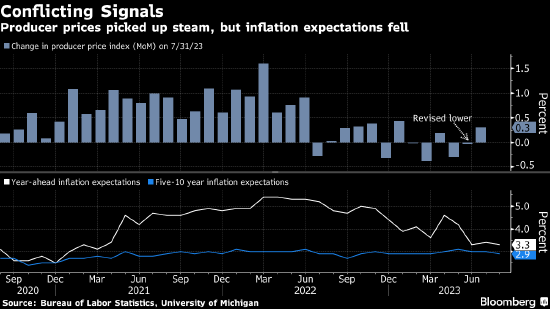 尽管汽油和日用杂货成本上升,但密歇根州大学消费者通胀预期在8月初意外下跌。与此同时,7月份生产者价格增长高于预期,主要是由于某些服务类别的价格上涨。