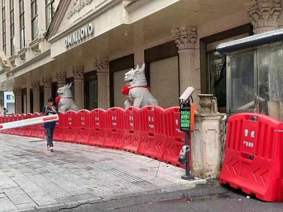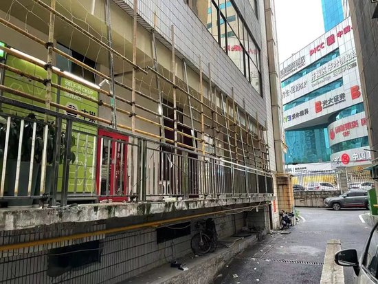 湖南玛丽莱珠宝大厦坐落在曾有长沙金融街之称的长沙市芙蓉中路上。8月6日下午,澎湃新闻记者在现场看到,大厦靠近大马路一侧,全部被围挡层层拦住,而其后侧的阳台已用栅栏封死,防止有人通过阳台翻进大厦。