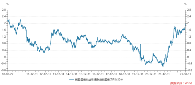 对于一些投资者而言,在过去18个月里,美联储累计加息已超过5个百分点,这意味着2%的“实际收益率”是一个颇具吸引力的买入点位。然而,也有人认为,美国通胀是否已见顶尚且存在不确定性,再加上美国政府借款需求与日俱增,各类长期收益率或许还将进一步上行。