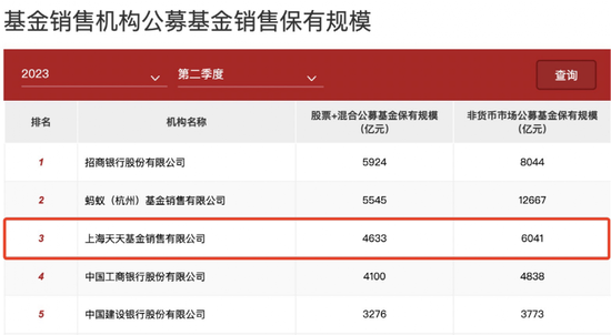 中国基金业协会数据显示,截止二季度末,天天基金管理股票+混合公募基金保有规模达到4633亿元,尽管相比一季度减少了221亿元,仍然蝉联行业第三名。此外,天天基金二季度末非货币市场公募基金保有规模也达到6041亿,相比一季度变化不大,同样保持行业第三。
