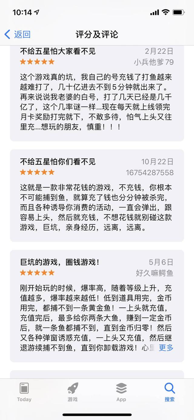 在手机应用商店下方,有网友评论道,“这是一款非常花钱的游戏,不充钱你根本不可能捕到鱼,就算充了钱也分分钟被杀完,而且各种诱导你消费的活动会一直弹出,很容易上头不断充钱”“第一天充了200还玩了5-6个小时才输完,第二天充了500不到2小时输完”“不充钱不爆鱼,充了钱给你一点甜头”。记者下载了该款游戏,打开后发现该游戏的实际年龄要求为17+而并非官方所说的18+,进入游戏时,需要输入姓名及身份证,记者使用了非本人信息,顺利通过,且无任何人脸识别等二次认证要求。