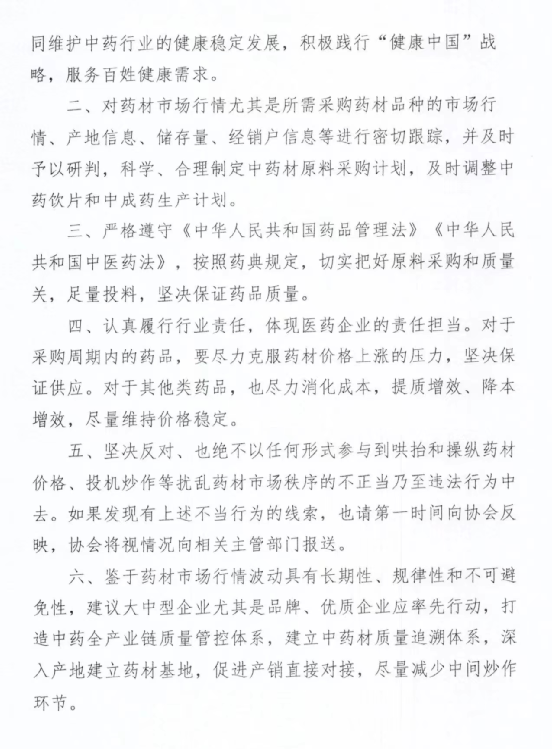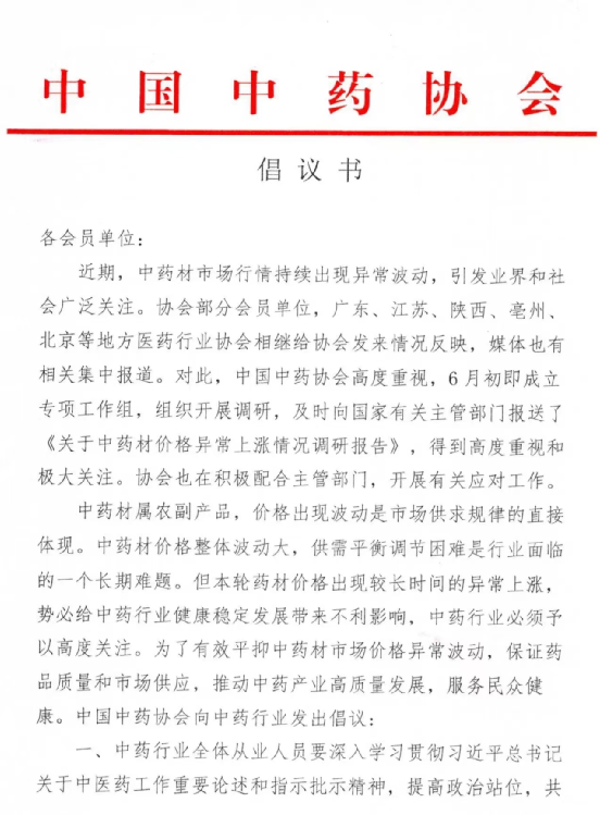 中药材价格的异动引发了行业协会的关注。7月8日,中国中药协会发出《倡议书》,“科学、合理制定中药材原料采购计划,及时调整中药饮片和中成药生产计划。”