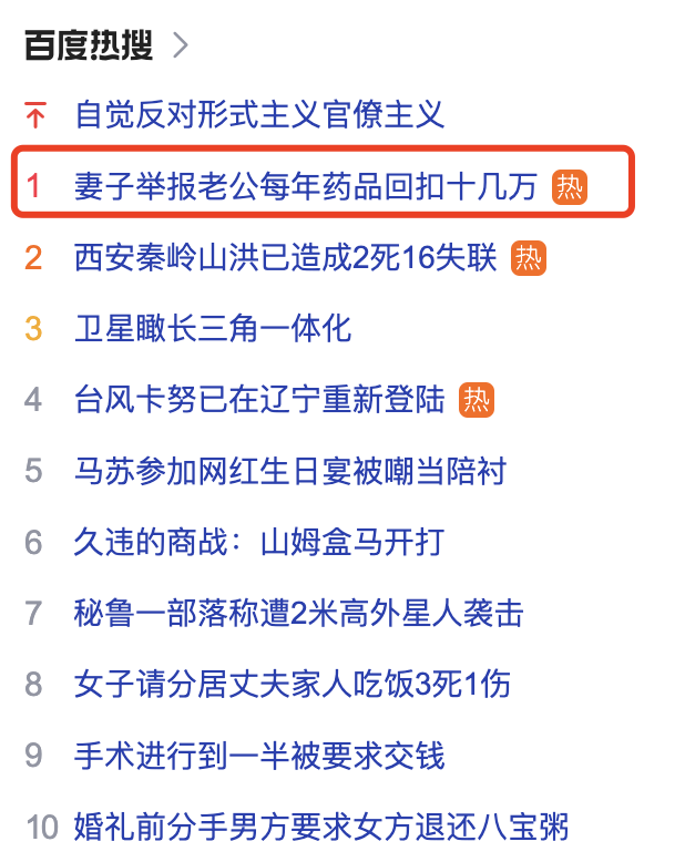 8月12日,一则关于“妻子举报老公每年药品回扣十几万”的话题冲上热搜榜首位,引发热议。