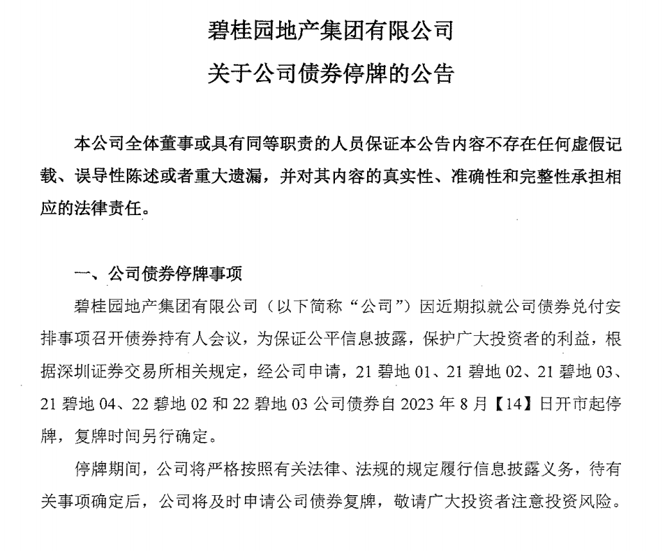 8月12日,“21碧地02”“22碧地02”“22碧地03”等多只碧桂园境内债同时发布债券停牌公告。