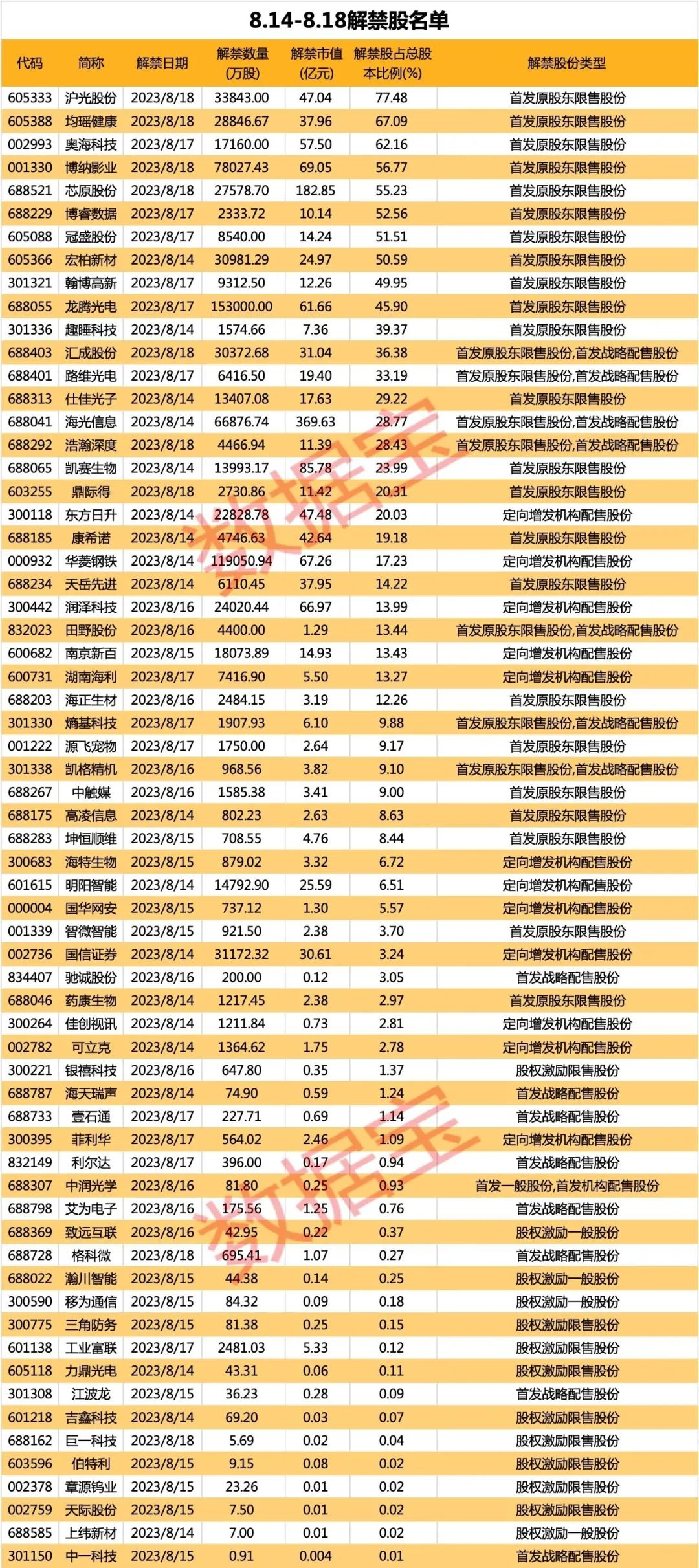 从解禁规模看,海光信息、芯原股份解禁市值居前,依次为369.63亿元、182.85亿元。前者解禁股类型为首发原股东限售股份和首发战略配售股份,后者为首发原股东限售股份。其余个股中,凯赛生物、博纳影业、华菱钢铁、润泽科技、龙腾光电、奥海科技解禁市值均在50亿元以上。