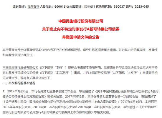 8月11日晚间,民生银行公告称,现综合考虑资本市场环境,经审慎分析与论证后决定终止本次向不特定对象发行可转换公司债券事项,并向上海证券交易所(简称“上交所”)申请撤回相关申请文件。