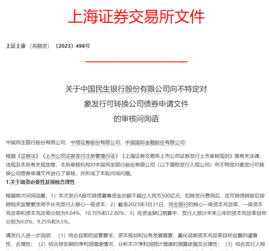 对于不超500亿的可转债再融资,在今年7月份的问询当中,上交所请民生银行进一步说明: