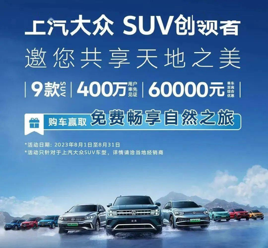 8月1日,上汽大众针对旗下9款SUV车型进行降价,最高降幅达6万元。优惠车型既包括燃油车,也包括新能源车。