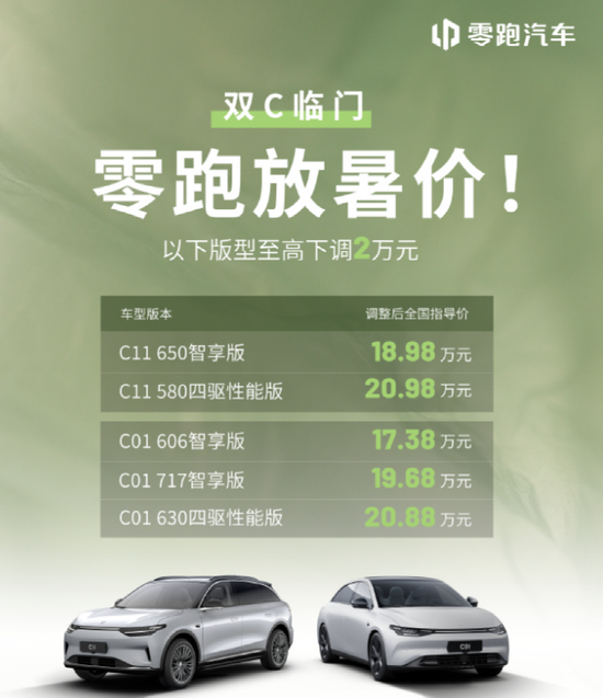同在8月1日,零跑汽车宣布,对零跑C11和零跑C01部分车型售价进行调整,部分版型至高下调2万元。