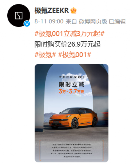 8月11日,吉利控股集团旗下高端智能电动品牌极氪宣布,对极氪001推出限时价格权益政策,降价幅度为3万-3.7万元,该政策适用于2023年8月11日9:00到12月31日24:00新下定用户。