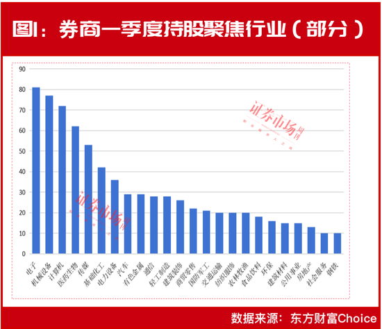 随着上市公司密集披露中报,作为投资“专业选手”的券商二季度持股名单也逐步被“剧透”。数据显示,目前(截至8月10日,下同),全A市场有270余家公司已正式披露今年中报,其中,在上市公司同步披露的二季度前十大流通股股东持仓名单中,券商的身影密集出现。据不完全统计,券商当前共现身持仓48只个股。仅从目前的持仓名单来看,券商二季度的布局风格与今年一季度高度相似。从今年一季度相对完整的披露名单来看,券商现身持仓电子、机械设备、计算机、医药生物、传媒、基础化工、电力设备、汽车等行业较为集中,持仓个股数量均超过20家(见图1)。
