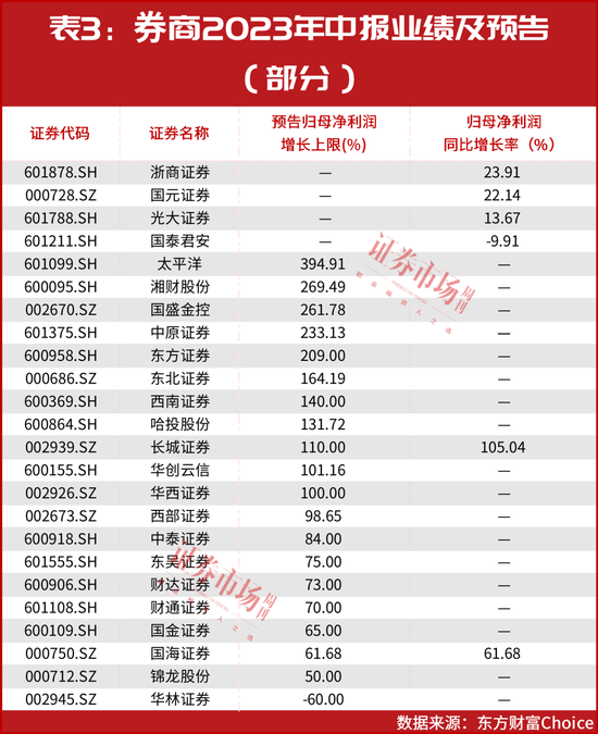 此前阶段,券商发挥了持续领涨的效应。尤其自7月下旬以来,受“活跃资本市场”等多重因素刺激,券商行情持续表现。截至目前,券商板块区间涨幅已达19%,从个股表现来看,太平洋、首创证券、信达证券、锦龙股份、红塔证券、哈投股份等多股涨幅超过30%。事实上,除了相关利好政策刺激,券商股的基本面也在迎来改善。目前,部分券商已正式披露中报,另外,不少券商则以快报或预告的形式剧透了今年上半年经营业绩,整体来看,多数公司业绩均呈现上升。目前,包括长城证券、国海证券、浙商证券、国元证券、光大证券(维权)等多家券商均以正式或快报的形式发布中报,绝大多数呈现增长。如长城证券增长了105.04%,国海证券增长了61.68%。此外,20家券商已发布中报业绩预告,其中19家业绩预增上限为正值(见表3)。另据观察发现,不少券商上半年业绩实现同比扭亏为盈。