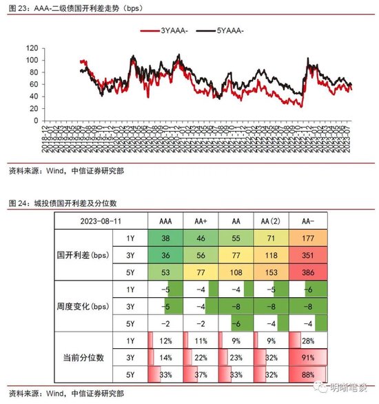 品种选择上,二级债利差大幅回落,城投债利差整体下行。本周二级债利差从之前的上行趋势回落明显,3年期和5年期AAA-国开利差分别变动-6bps和-3bps,当前分别为52bps和60bps,分别处于2019年以来的40%和24%分位数。但二级债的预期依旧偏积极,看好基准利率打开空间后二级债的超额收益机会。城投债方面,整体呈现下行趋势,下行2~8bps,3Y中低等级下行尤甚,均下降了8bps。中央“一揽子化债方案”和新一轮建制县化债试点的落地预期对城投债形成利好,对中低等级的城投债信用有一定提升。。目前不同省份获取置换额度的空间差异较大,预计未来城投债的分化趋势将更加明显。