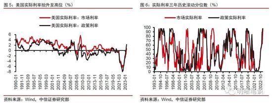 美联储去年3月至今持续加息也推升了美国的实际利率,但与其经济强度较为匹配。与我国的宽货币周期不同,在疫后经济过热、通胀飙升的压力下,美联储在去年3月开启了加息周期,而截至7月27日联邦基金目标利率已经抬升至5.5%的高位,其实际利率的历史三年滚动分位数也回升至了97%以上的相对高位。考虑到疫情冲击期间美联储维持了极低的政策利率,因而当下实际利率较高的分位数有一定基数效应的影响;从数值上来看,当前美国的实际利率仍然位于上世纪90年代以来的偏低水准。此外,美国二季度GDP环比折年季调初值2.4%,就业和消费数据仍然较为强劲,当下的实际利率与其缓解经济过热的政策目标仍较为匹配。