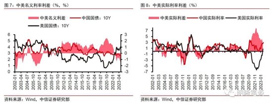 中美名义利差倒挂的同时,实际利率利差仍然为正。去年三月美联储加息至今,10Y美债利率持续抬升并与我国10Y国债利率持续倒挂,然而中美实际利率则在2020年6月以来持续为正,尽管2022年3月后不断收窄,但当下中国10Y国债-美国10Y国债利差仍有1.92pct左右。总结来看,中国处于宽货币周期,需要维持低利率环境刺激融资需求抬升,美国则处于紧货币周期,需要抬升利率以压降其国内经济杠杆,而中国实际利率却高于美国。从中美利差的视角上来看,我国实际利率至少要低于美国的水准,而7月美国实际利率为2.3%;结合美联储年内加息预期放缓而通胀压力逐步减轻的假设,我们判断我国实际利率理论上应当至少低于这一数值。