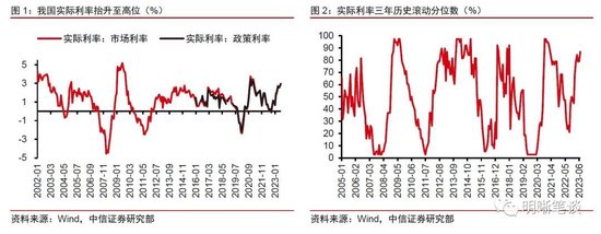 2023年以来通胀持续回踩环境下,实际利率上行至历史相对高位。除去10Y国债收益率减去CPI同比测算的实际利率外,将1年期MLF利率减去CPI同比增速则可以体现政策利率层面的实际利率。观察市场和政策利率所对应的实际利率走势,不难发现2022年以来两者持续高企,而今年7月已回升至2.9%以上,历史三年滚动分位数也回升至87%附近,与名义利率的走低形成鲜明的对比。本轮实际利率的上行由通胀读数回踩主导,而后者主要原因在于今年猪肉等部分商品价格结构性走低,叠加疫情长尾影响下居民对未来收入、就业预期不稳,进而消费需求偏弱,限制了非食品项的涨价动力。随着通胀的走弱,本轮降息周期对实体经济的实际融资成本的调降效果被对冲。2022年全年以及2020年上半年实际利率基本维持在1%以下,虽然今年防疫政策优化落地后基本面潜在修复的动能可能更高,但1%仍然是经济修复阶段实际利率的一个参考阈值。