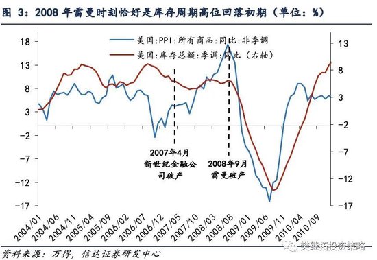 对比这两个阶段库存周期所处的位置,2007年危机刚出现时,美国经济的库存周期处在下降末期到回升初期,上一轮库存周期下降的风险已经兑现充分,而2008年雷曼破产时,库存周期处在下降初期,库存周期下降的风险、房地产风险和金融流动性风险形成了共振,所以对经济和股市的冲击更大。
