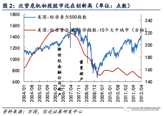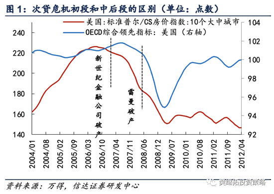 美国2008年的次贷危机大概可以分成两个阶段。第一阶段:危机出现阶段。2007年2月,汇丰银行宣布北美住房贷款按揭业务遭受巨额损失,次贷危机由此拉开序幕。2007年4月,美国第二大次级抵押贷款公司新世纪金融公司因无力偿还债务而申请破产保护。随后30余家美国次级抵押贷款公司陆续停业。此时美国房价已经开始下降,但从OECD经济领先指数来看,美国经济依然在继续上行,特别是很多上游商品的价格依然在继续上行,标普指数又继续涨了半年。第二阶段:全面扩散阶段。2008年3月中旬,贝尔斯登因流动性不足和资产损失被摩根大通收购,次贷危机愈演愈烈,华尔街整体陷入流动性危机。2008年7月中旬,美国房地产抵押贷款巨头“两房”遭受700亿美元巨额亏损,最终被美国政府接管。作为美国最大的汽车厂商,通用公司的股价跌至50余年来的最低水平,破产危机隐现。2008年9月中旬,美国第四大投资银行雷曼兄弟陷入严重财务危机并申请破产保护。美林证券被美国银行收购。华尔街的五大投行倒闭了3家。雷曼兄弟的破产(雷曼时刻),彻底击垮了全球投资者的信心,包括中国在内的全球股市持续下跌。