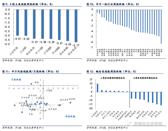 上周A股主要指数均下跌,深证成指(-3.77%)跌幅最大,上证综指(-3.01%)跌幅最小,申万一级行业本周均下跌,其中通信(-6.26%)、建筑材料(-4.87%)、家用电器(-4.79%)领跌。概念股中,卫星概念(10.01%)、远程办公(2.29%)、芬太尼(1.92%)领涨,激光雷达(-15.96%)领跌。